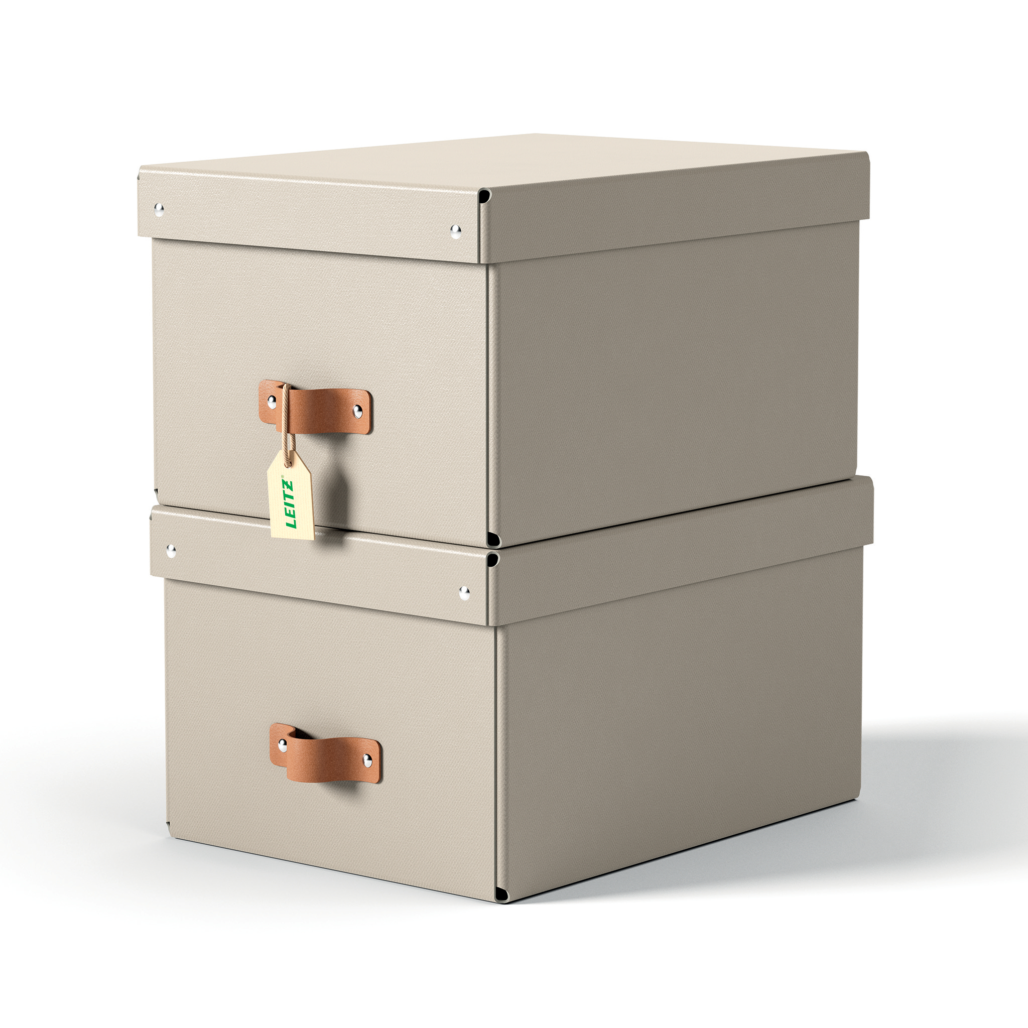 Leitz Puro Aufbewahrungsbox mit Deckel, mittel, 17L, 100% recycelter Karton, 2er-Pack · Ordnung halten und sich wohlfühlen - mit den Leitz Puro mittelgroßen Aufbewahrungsboxen aus Karton mit Deckel schaffen Sie sofortigen Stauraum und befreien Ihre Räume von Unordnung. Dieses Set aus zwei dekorativen Aufbewahrungsboxen mit einem Fassungsvermögen von 17 Litern hilft Ihnen, Ihr Zuhause und Ihr Büro zu organisieren und verleiht Ihrer Aufbewahrung Stil. Diese hochwertigen Boxen lassen sich platzsparend stapeln und sind ideal für die Aufbewahrung von A4-Dokumenten, Laptops, Spielzeug, Schuhen und Bastelmaterial. Die Leitz Boxen werden flach verpackt geliefert und sind schnell und einfach ohne Werkzeug zu montieren. Diese stapelbaren Aufbewahrungsboxen sind zu 100 % aus recyceltem FSC-zertifiziertem Karton hergestellt und können nach Gebrauch zu 100 % recycelt werden. Die Auswahl an erdigen Farben - inspiriert von der Reinheit und Schlichtheit der Natur - passt perfekt zu Ihrer Einrichtung und bringt Ruhe in Ihre Räume und Büros. Jede Leitz Aufbewahrungsbox ist mit einem ledernen Griff ausgestattet, der das einfache Herausnehmen aus Regalen und Schränken ermöglicht. Hergestellt in Italien. Feel Good mit Leitz. · Set aus zwei mittelgroßen Aufbewahrungsboxen aus Karton mit Deckeln. 17L. Leicht zu montierende Aufbewahrungsbox für A4-Dokumente und andere Gegenstände. 100% recycelter Karton. · Set aus zwei mittelgroßen Aufbewahrungsboxen mit Deckel aus 100 % recyceltem FSC-zertifiziertem Karton in modernem und schlichtem Design, das Ihr Zuhause und Büro ergänzt · Vielseitiger Stauraum mit einem Fassungsvermögen von 17 Litern, ideal für A4-Dokumente, 14-Zoll-Laptops, Spielzeug, Hobby- und Bastelzubehör sowie für die Organisation von Accessoires in Ihrem Kleiderschrank, die leicht zugänglich sein müssen · Starkes und haltbares Material ermöglicht sicheres und platzsparendes Stapeln der Boxen während der Aufbewahrung. · Erhältlich in einer Auswahl an ruhigen, erdigen Farben mit matter Oberfläche, die Sie kombinieren können, um einen modernen und organisierten Raum zu schaffen · Dank des eleganten Ledergriffs lassen sich die Aufbewahrungsboxen aus Karton leicht aus Regalen, Schränken, oder Garderoben entnehmen · Passt perfekt in kubische Möbel, auf Ablageflächen, in die meisten Standard-Schubladen und kann als Aufbewahrung unter dem Bett verwendet werden · Wird flach verpackt in einer plastikfreien Verpackung geliefert und lässt sich einfach und ohne Werkzeug montieren · Kann zu 100 % recycelt werden, indem die Aufbewahrungsboxen einfach in einzelne Teile zerlegt werden · Hochwertige stapelbare Aufbewahrungsboxen, Made in Italy · FEEL GOOD mit Leitz ·