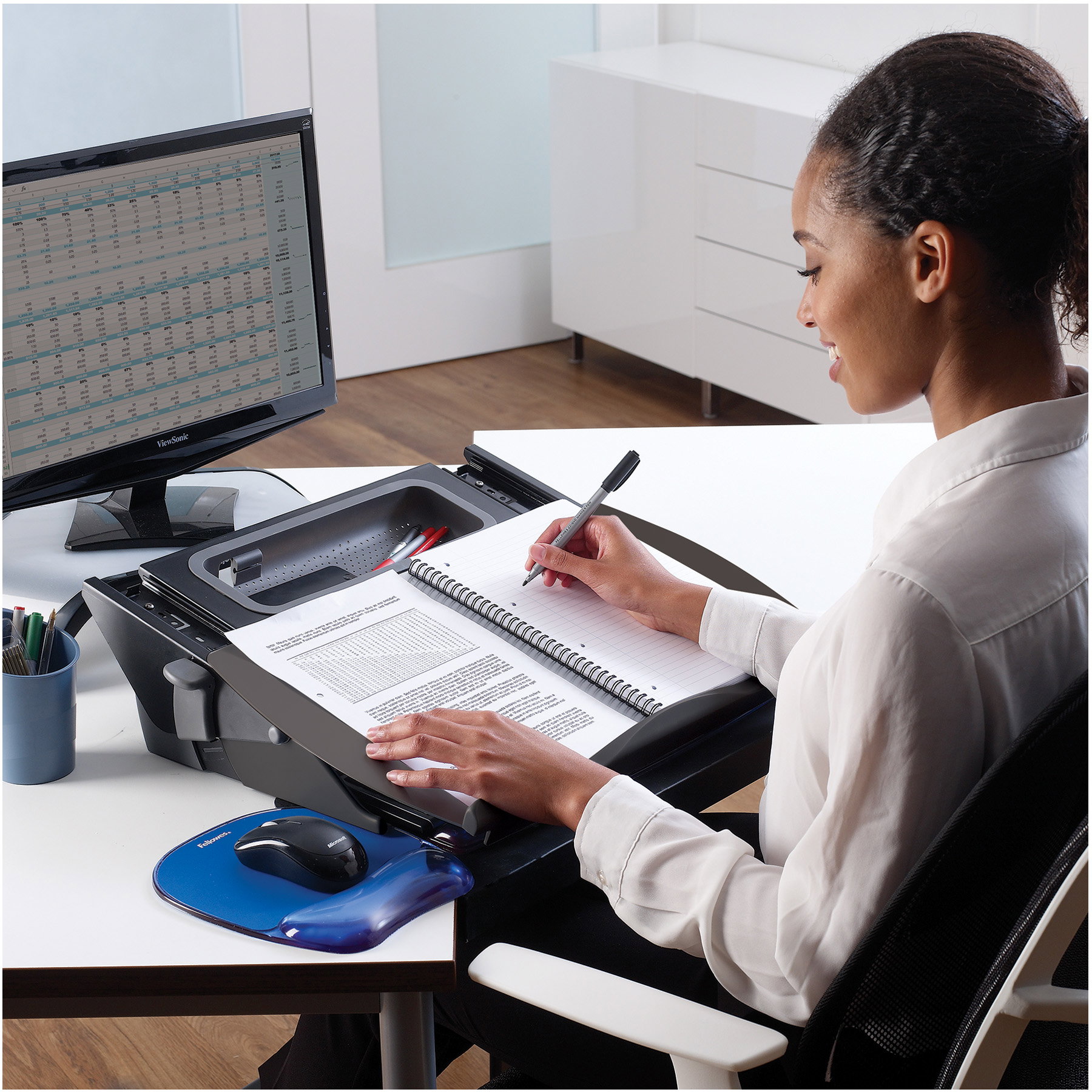 Zur Nutzung zwischen Monitor/Laptop und Tastatur. Plattform gleitet stufenlos nach vorne zur Abdeckung der Tastatur und Schaffung einer ergonomischen Schreibunterlage. Mit herausnehmbarem Zubehörfach.