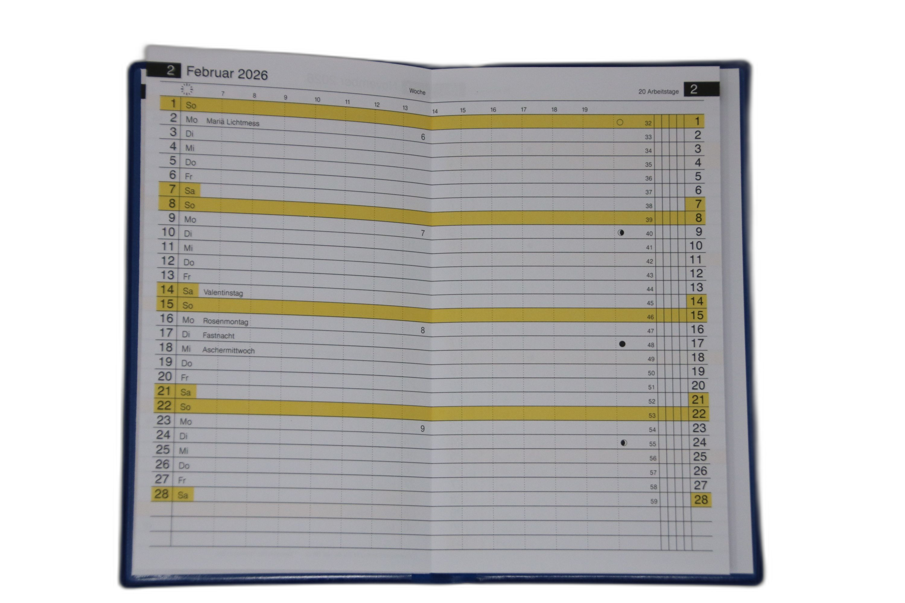 | Kalenderaufteilung: | 1 Monat/2 Seiten |