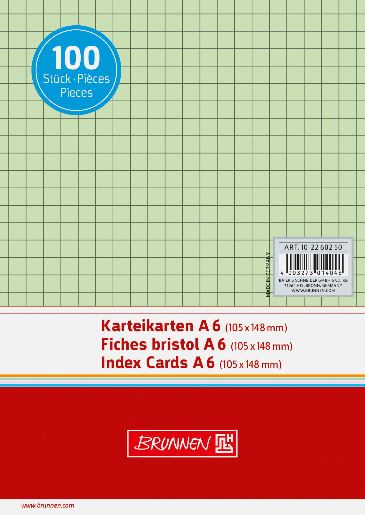 Produktbeschreibung Karteikarten BRUNNEN 22602 A6 kariert grün 100 Stück