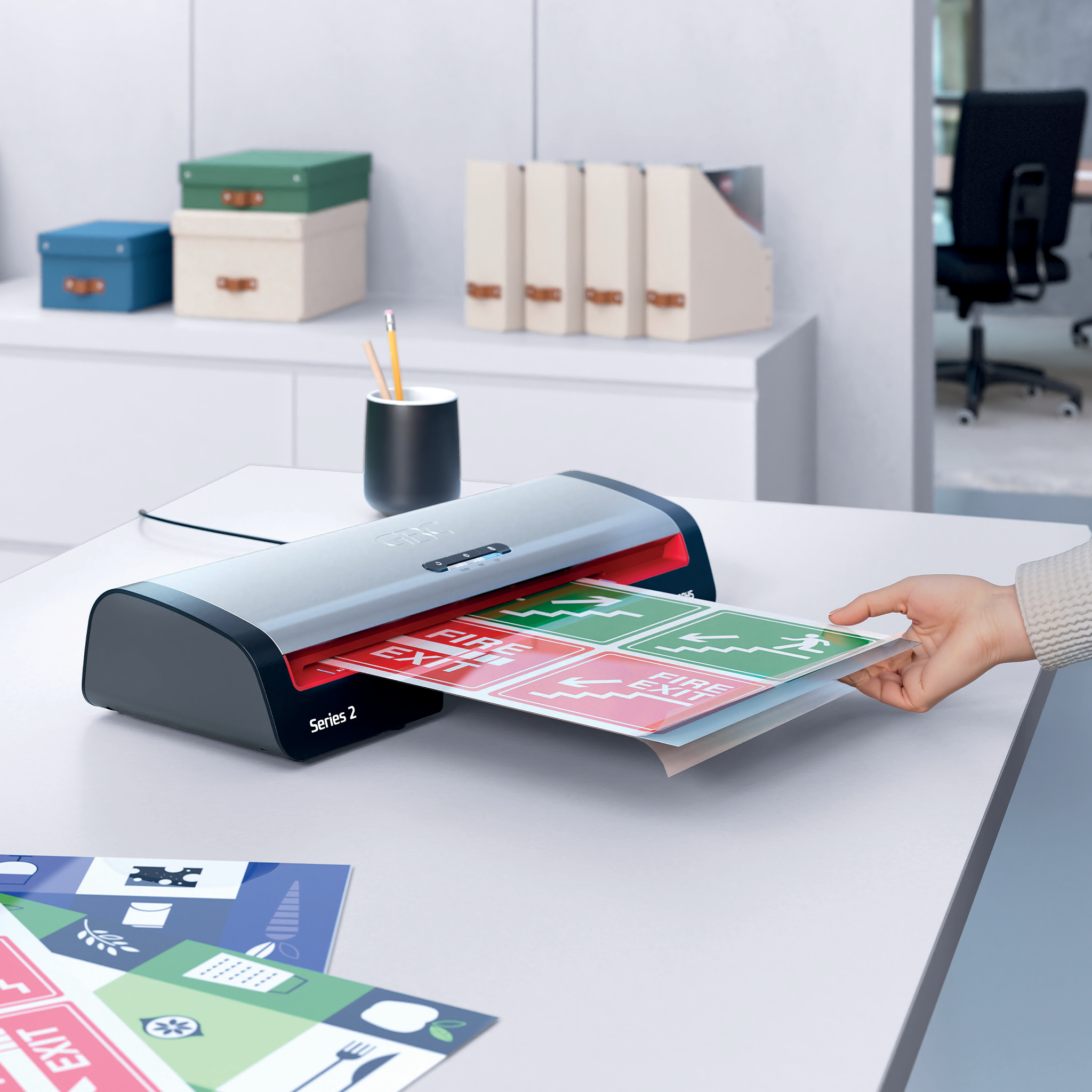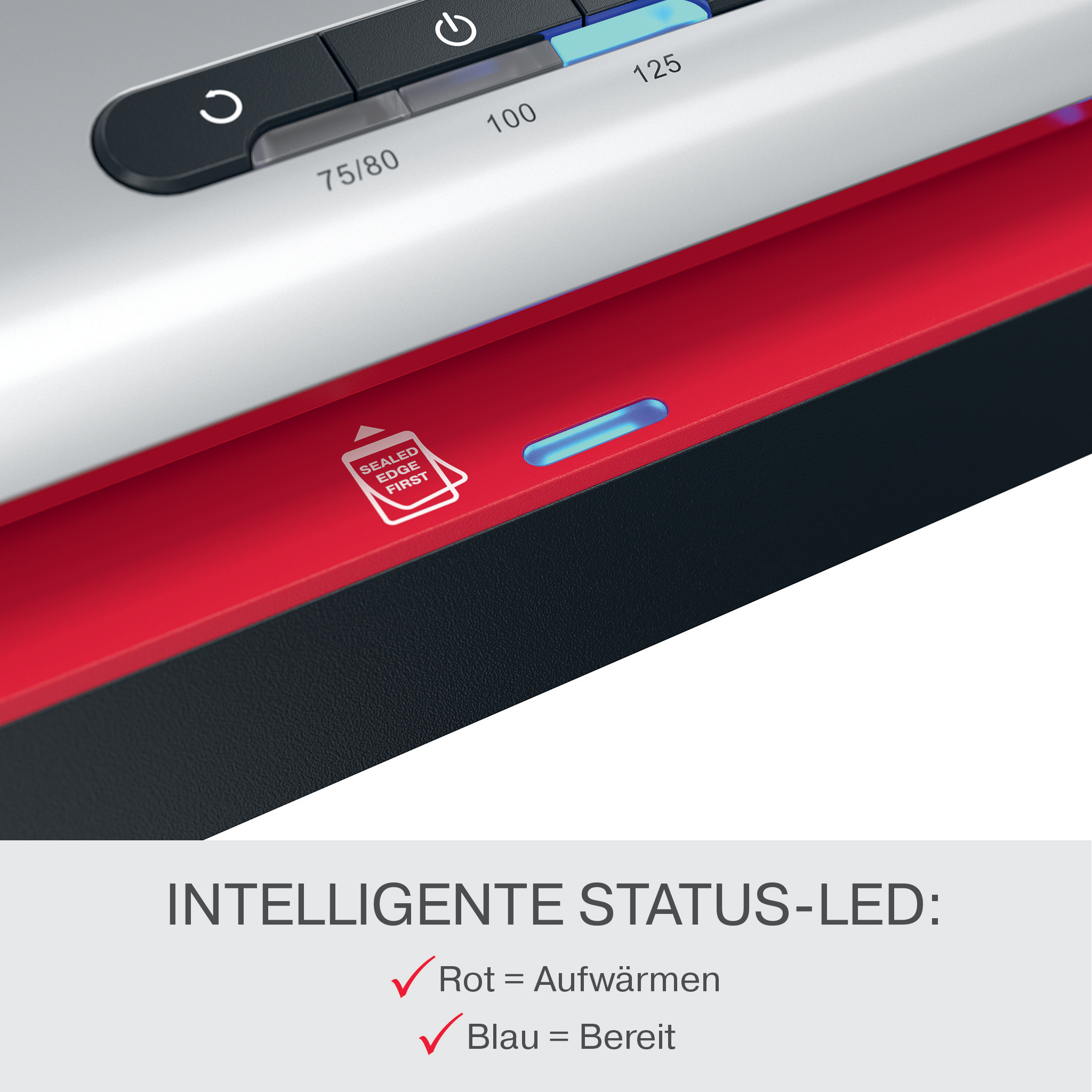 GBC 250HS Büro A3-Laminiergerät bis 125 Mikron, 1 Minute Aufwärmzeit, 500mm/Min · Das GBC 250HS A3-Laminiergerät ist eine zuverlässige und effiziente Lösung für den täglichen Laminierbedarf im Büro. Dieses Hochgeschwindigkeits-Laminiergerät wurde für professionelle Umgebungen entwickelt und verbindet Leistung mit Benutzerfreundlichkeit. Steigern Sie Ihre Produktivität und reduzieren Sie die Laminierzeit um 33 % mit GBC-Hochgeschwindigkeitsfolien. Mit einer schnellen Aufwärmzeit von 1 Minute laminiert es ein 75-Micron-A4-Blatt in nur 36 Sekunden und ist damit ideal für schnelle Büroarbeiten. Das intuitive Bedienfeld bietet drei Einstellungen für die Foliendicke von 75 bis 125 Mikron und damit Flexibilität für verschiedene Dokumententypen. Das Bedienfeld verfügt außerdem über eine Rücklaufsperrtaste, mit der sich falsch eingezogenen Folien problemlos entfernen lassen. Darüber hinaus bietet das SMART-Status-LED-System klare visuelle und akustische Hinweise: rot während des Aufwärmens, blau mit einem Ton, wenn das Gerät bereit ist, und eine automatische Abschaltung nach 15 Minuten Inaktivität, um Energie zu sparen. Die SMART-Eingangsführungs-LEDs sorgen für eine gerade Ausrichtung der Folien, um Staus zu vermeiden, und machen jede Laminierung perfekt. Schützen und bewahren Sie Ihre wichtigen Dokumente mit Schnelligkeit und einer glatten, professionellen Oberfläche. Schwarze und rote Farbe. · Schützen Sie Ihre wichtigen Dokumente mit dem GBC 250HS Hochgeschwindigkeits-A3-Büro-Laminiergerät. Mit einer schnellen Aufwärmzeit von 1 Minute und der Fähigkeit, ein A4-Blatt mit einer Stärke von 75 Mikron in nur 36 Sekunden zu laminieren, gewährleistet es effiziente, hochwertige Ergebnisse für alle Ihre professionellen Laminieranforderungen. · Schnelle Aufwärmzeit, einsatzbereit in nur 1 Minute. · Kompatibel mit Folien von 75 bis 125 Mikrometern. Laminiert ID-Karten bis hin zu Dokumenten im Format A3. · GBC High-Speed-Laminatoren reduzieren die Laminierzeit um 33 %, wenn GBC-Hochgeschwindigkeitsfolien verwendet werden. · Laminiert ein A4-Dokument (75 mic) in nur 36 Sekunden. · Laminiert 16 x A4 in 10 Minuten. · SMART-Status-LED: leuchtet während der Aufwärmphase rot und wird blau mit einem akustischen Signal, wenn das Laminiergerät betriebsbereit ist. · SMART-Eingangsführungs-LEDs: stellen sicher, dass die Folien gerade durch das Laminiergerät geführt werden, um Staus zu vermeiden. · Das Bedienfeld verfügt über eine Rücklaufschutztaste, mit der sich falsch eingezogene Folien leicht entfernen lassen. · Enthält ein Starterpaket mit 5x A4-Folien (75 Mikron). · Sparen Sie Energie mit der 15-minütigen Abschaltautomatik, die sich bei Inaktivität einschaltet. · Niedriger Geräuschpegel <50Dba für weniger Ablenkung. · Für beste Ergebnisse mit Original GBC-Folien verwenden: z.B. A4 Laminiertasche 2 x 75 Mikron, 100 Stück (Art. Nr. 3740400). CE-zertifiziert, TUV/GS.