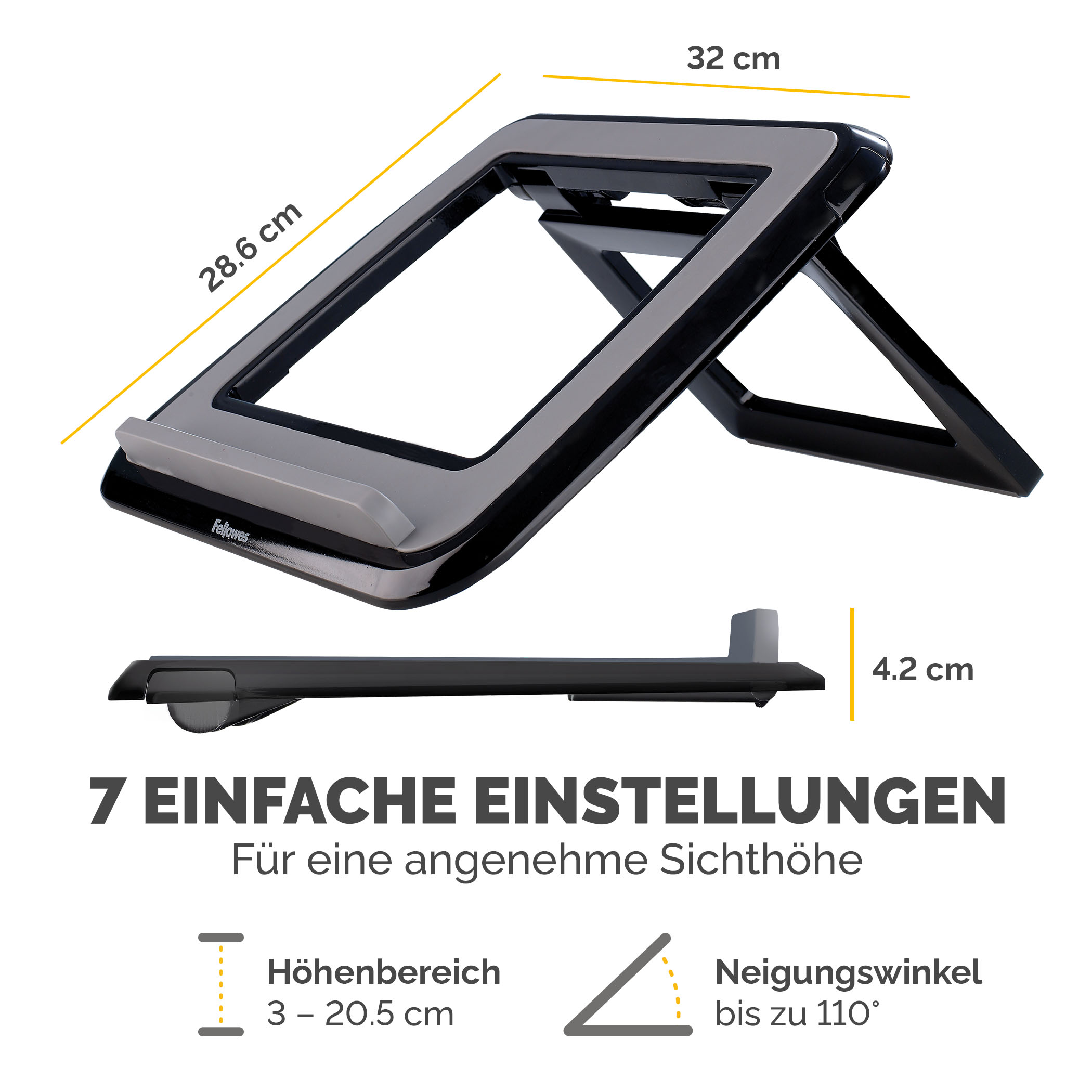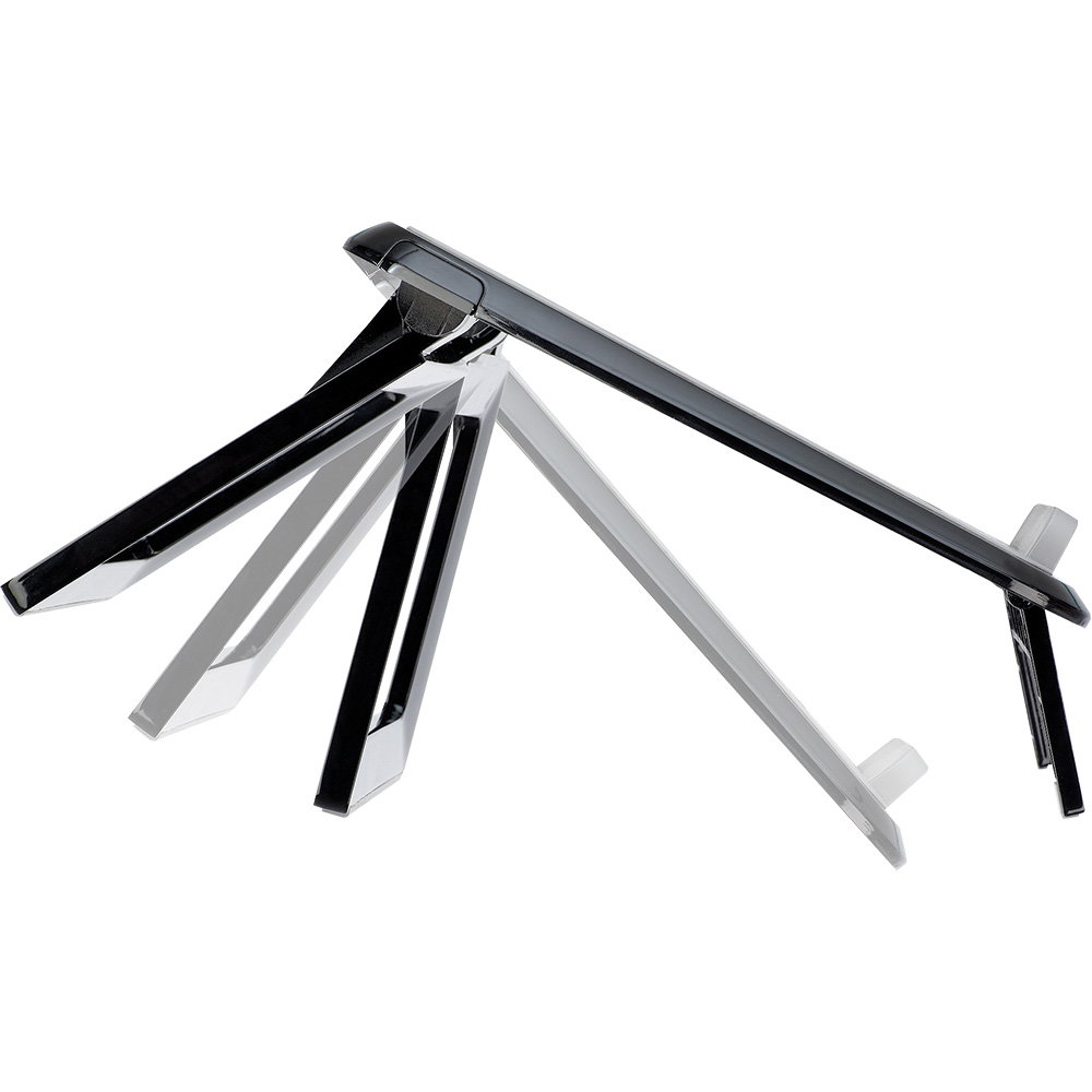 Einfach in 7 verschiedenen Höhen/Winkeln einstellbar. Ausklappbare Füße an der Vorderseite. Vordere, gummierte Kante hält Laptop sicher. Ermöglicht verbesserte Luftzirkulation und Kühlung des Laptops. Empfohlene Verwendung zusammen mit einer externen Tastatur und Maus.