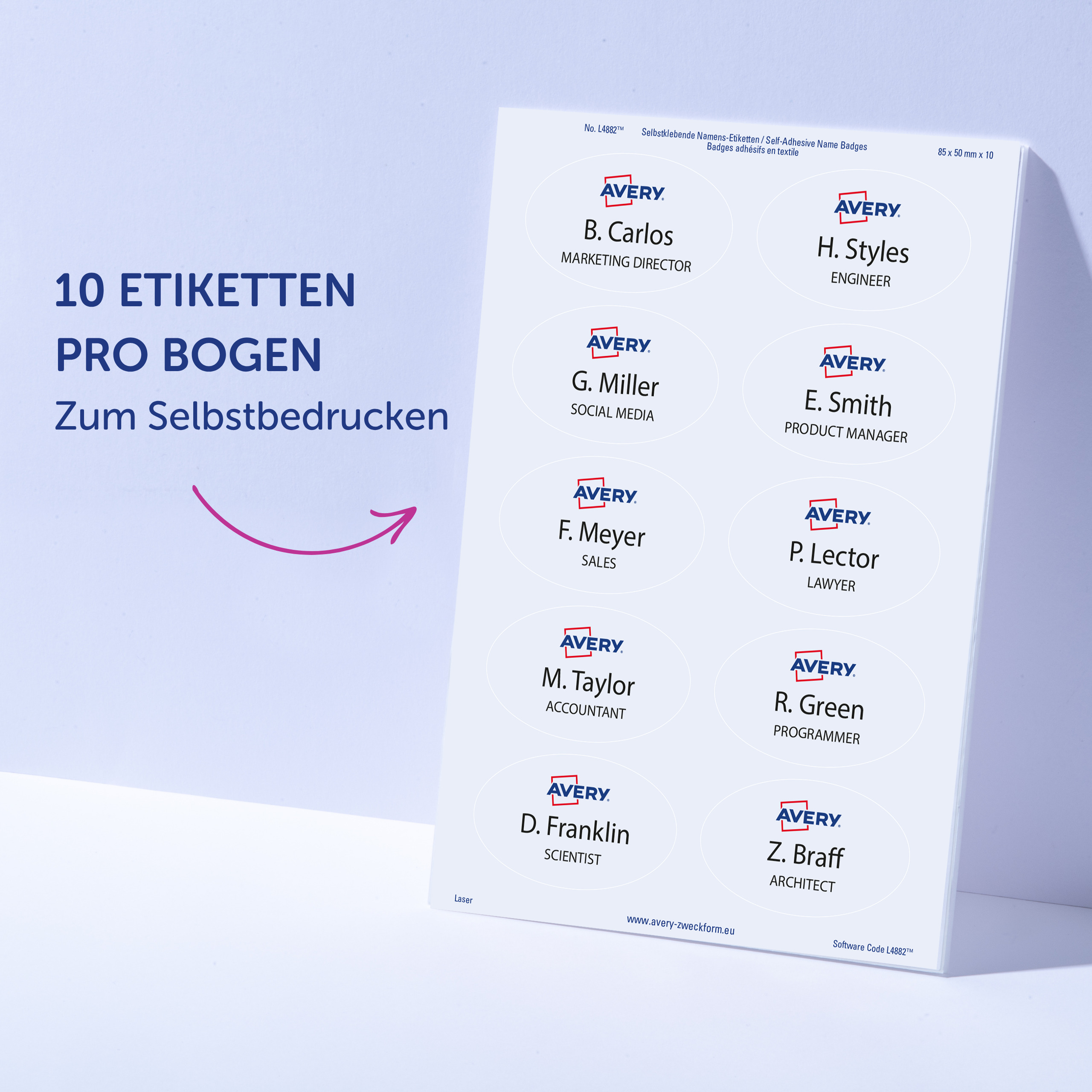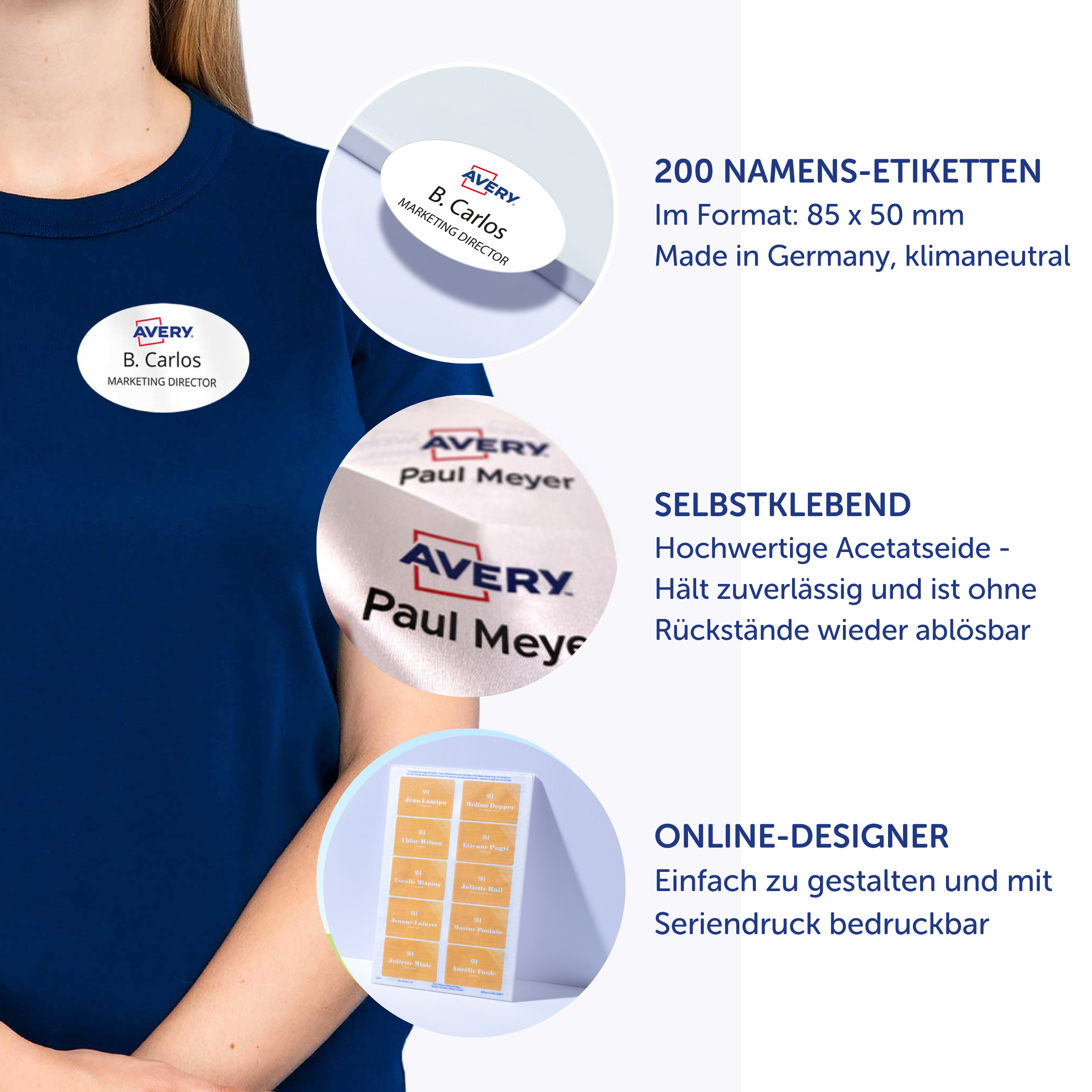 Qualität vom Etiketten-Experten: die selbstklebenden, ablösbaren Namens-Etiketten L4785-20 für Laser-Drucker von Avery Zweckform im Format 80 x 50 mm erleichtern Ihnen die Organisation von Veranstaltungen, Seminaren und Konferenzen. 200 weiße, bedruckbare Textil-Etiketten auf 20 Bogen. Die rechteckigen Namensschilder sind die perfekte Alternative zu Plastikschildern mit Nadel oder Clip. Die Namensschilder aus Acetatseide haften zuverlässig auf Kleidung und Textilien und lassen sich rückstandsfrei wieder ablösen. Die Rückseiten-Stanzung der Namensschilder erlaubt das einfache Heraustrennen der Namens-Etiketten samt Trägerfolie für eine spätere Verwendung. Die Textil-Etiketten sind nicht geeignet für Leder, Seide, Samt und andere empfindliche Textilien. Die Namens-Etiketten bieten einen garantiert staufreien Druckerdurchlauf auf allen gängigen Laser-Druckern. So arbeiten Sie effizient wie stressfrei und schaffen sich wertvolle Zeit für die wirklich wichtigen Dinge. Ideen drucken - einfach & professionell: mit Etiketten von Avery Zweckform können Sie den kostenlosen Online Etiketten-Designer unter www.avery.eu/print nutzen. Gestalten Sie Ihr Etikett mit der Software komplett selbst, verwenden Sie eine der Design-Vorlagen zu zahlreichen Themen, die Sie individuell anpassen können oder laden Sie Ihr fertiges Design hoch und drucken anschließend standgenau aus. So schnell und einfach sorgen Sie für einen professionellen Auftritt. Think & Care - Avery Zweckform ist seit 2020 klimaneutral: die Treibhausgasemissionen des Standortes werden durch zertifizierte Klimaschutzprojekte ausgeglichen. Schon seit 2014 wird ausschließlich Ökostrom/-gas verwendet. Forschung, Entwicklung, Produktion, Logistik und Verwaltung am Firmenstandort in Oberlaindern/Bayern garantieren höchste Qualitäts- und Umweltstandards sowie kurze Lieferwege. Die Etiketten aus PVC-freier Acetatseide werden klimaneutral hergestellt, die Emissionen des Materials werden kompensiert. Made in Germany.