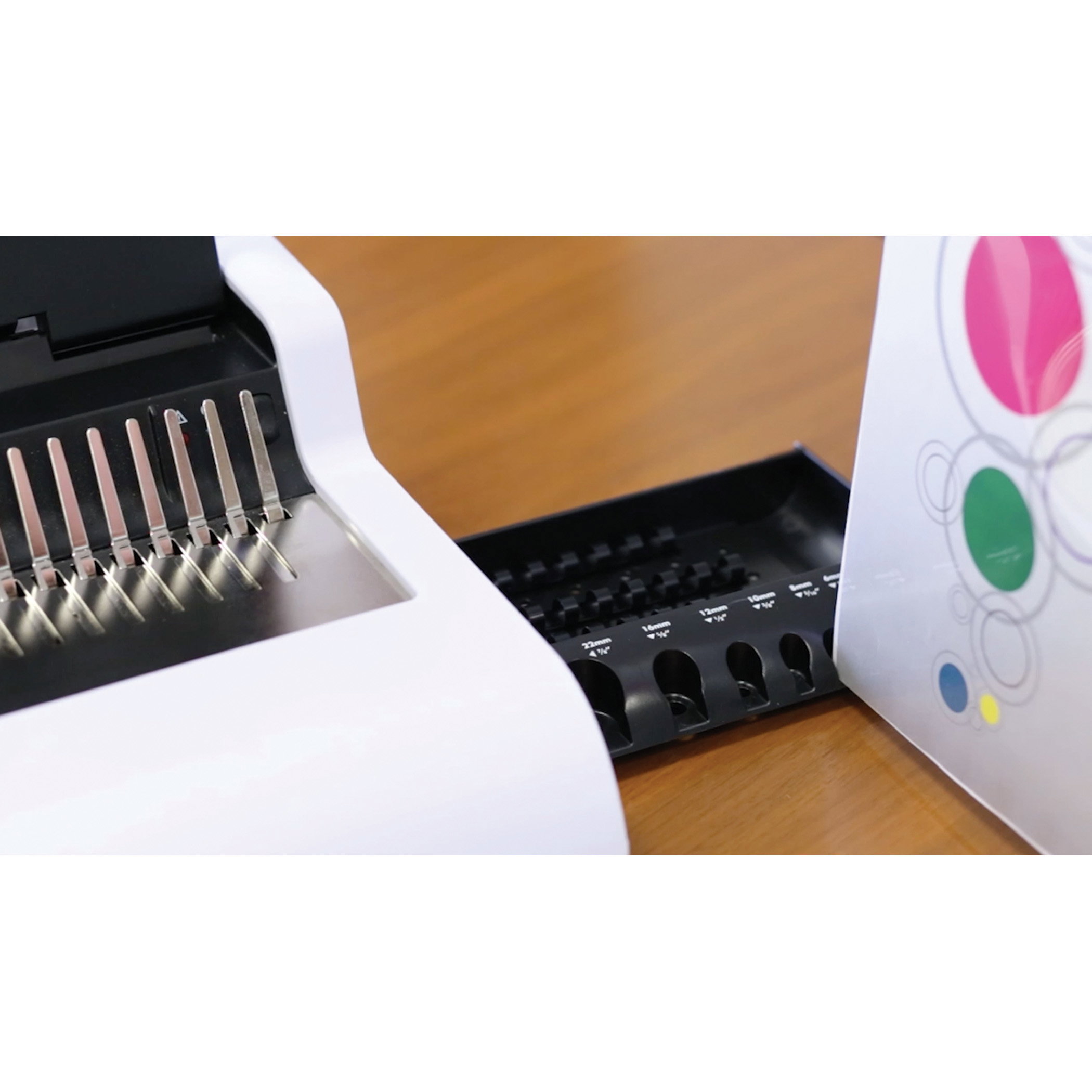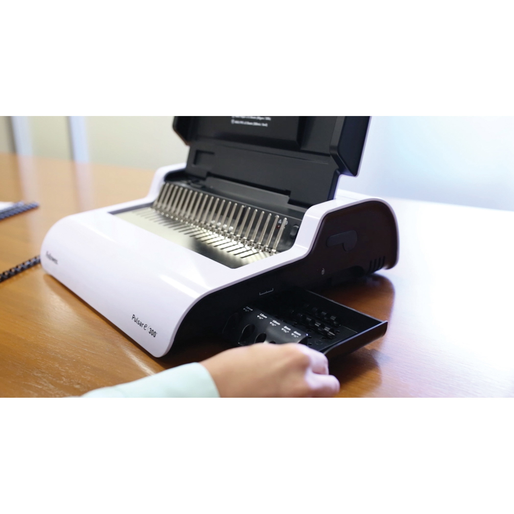 Das Pulsar-E 300 elektrische Plastikbindegerät eignet sich für die regelmäßige Verwendung in kleinen Büros. Die benutzerfreundlichen Funktionen von Pulsar-E 300 ermöglichen unkompliziertes, effizientes Binden, z.B. sorgt der einstellbare Randanschlag für exakte Ausrichtung des Papiers und das Aufbewahrungsfach mit Binderücken-Messfunktion für die einfache Auswahl des passenden Binderückens. Das Stanzrestefach öffnet sich automatisch wenn es geleert werden muss.