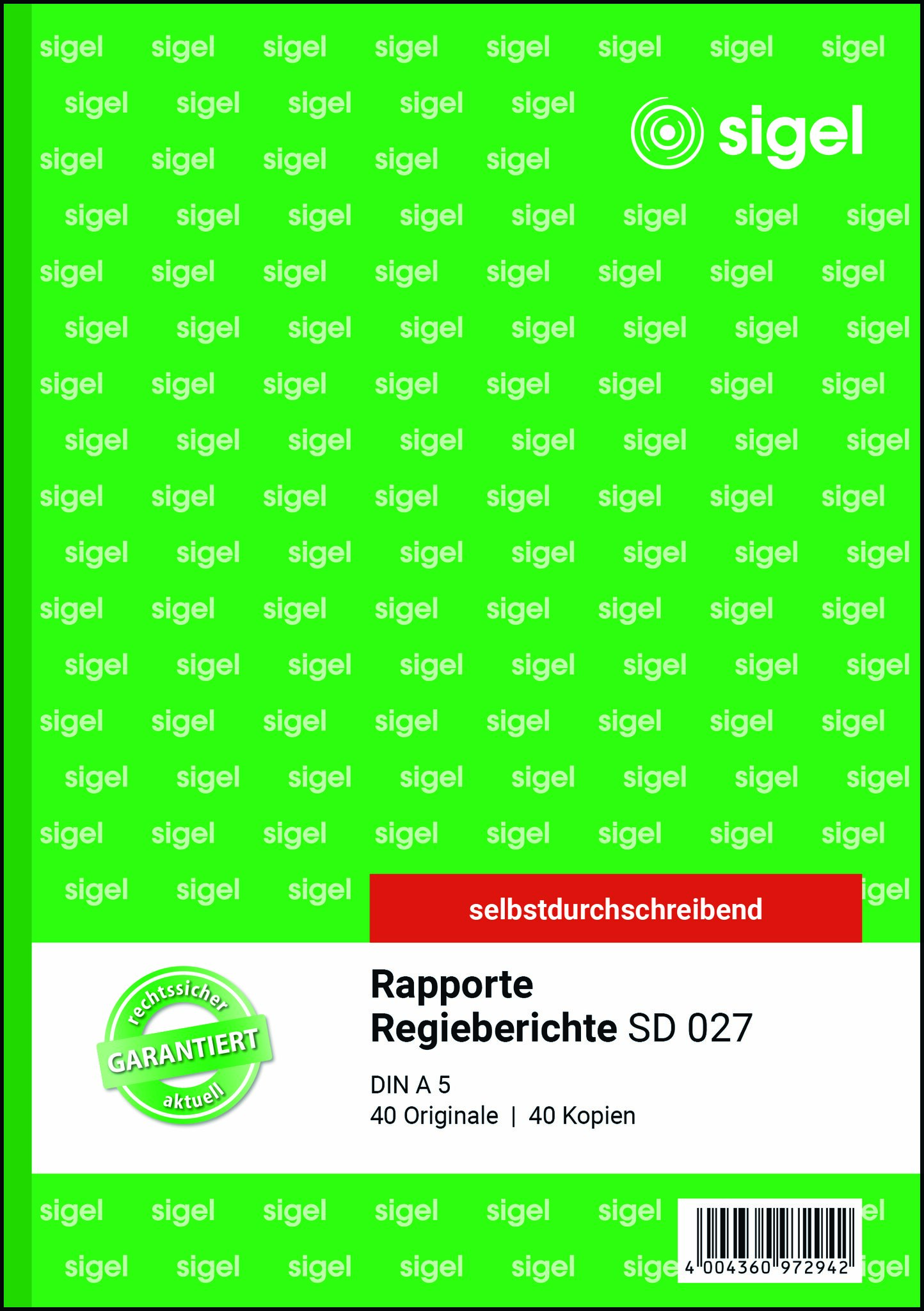 Speziell für Bau und Handwerk. Stets auf dem aktuellen Stand der Gesetzgebung: Rapporte/Regieberichte, A5, 2x 40 Blatt, FSC-zertifiziert. Ihre Produktvorteile:Zur Erfassung von Arbeitsleistung, Material und Arbeitszeit1. und 2. Blatt bedruckt, farbige Kopie zum Verbleib im BuchMit ultrafeiner Microperforation zum leichten Heraustrennen und AbheftlochungSelbstdurchschreibend mit integrierter Schreibunterlage: kein Durchschreiben auf die nächsten SeitenBlätter sicher gebunden dank stabiler Rückenleimung und LeinenfälzelPerfekt vom ersten bis zum letzten Blatt: SIGEL Formularbücher sind rechtssicher, praxisbewährt und millionenfach im Einsatz. Formulare sind unentbehrliche Helfer im Geschäftsalltag. Für jeden Zweck und Anwendungsbereich finden Sie bei SIGEL das passende Formular - umweltfreundlich produziert in hochwertigster deutscher Markenqualität. Jedes Produkt ist von Rechtsexperten geprüft und somit auf dem aktuellen Stand der Gesetzgebung. Lieferumfang: 1x Rapporte/Regieberichte SD027, 40 Sätze