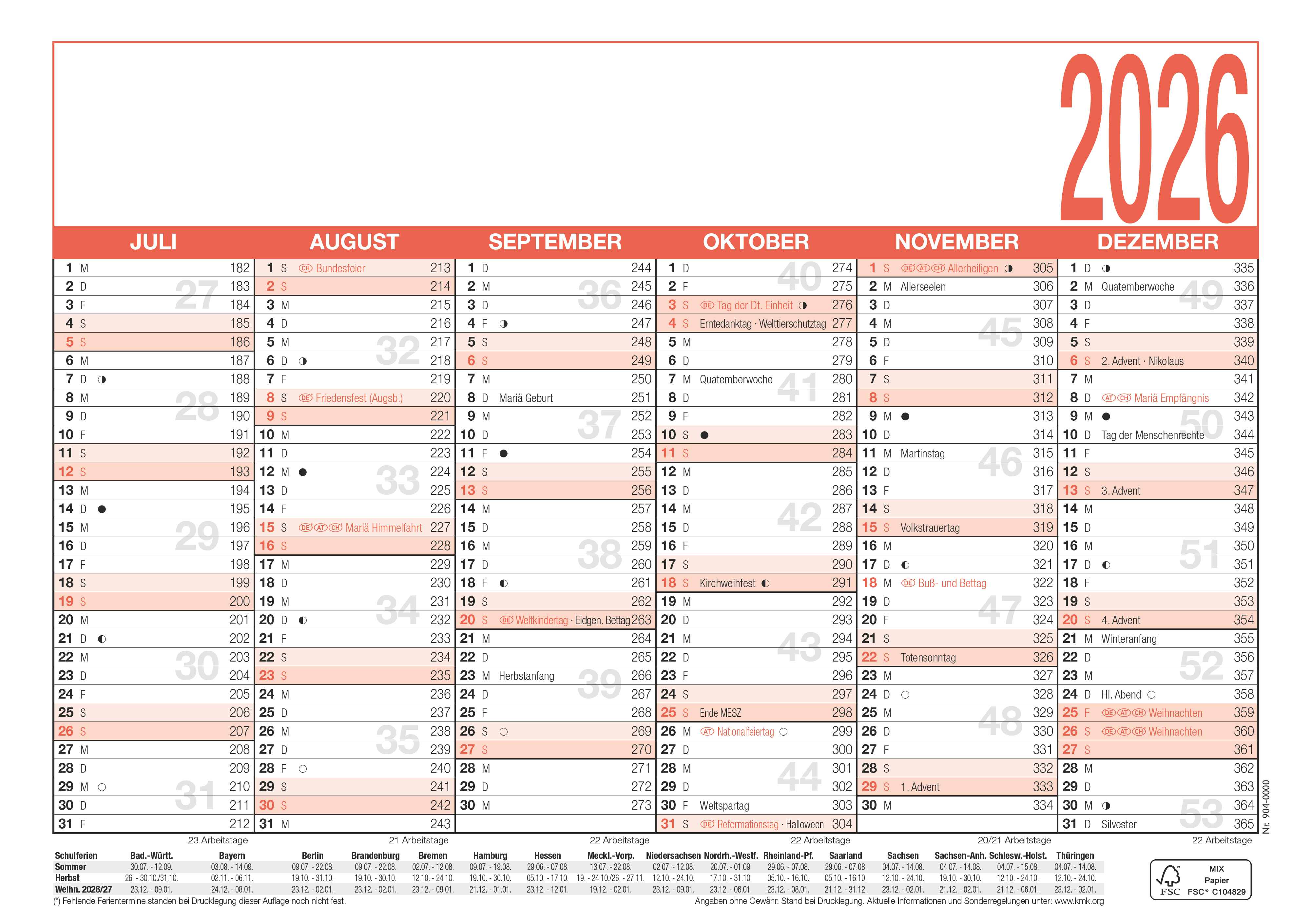 Tafelkalender Zettler 904 A5 1S/6M PEFC, ARBEITSTAGE-, TAGES-, WOCHENZÄHLUN