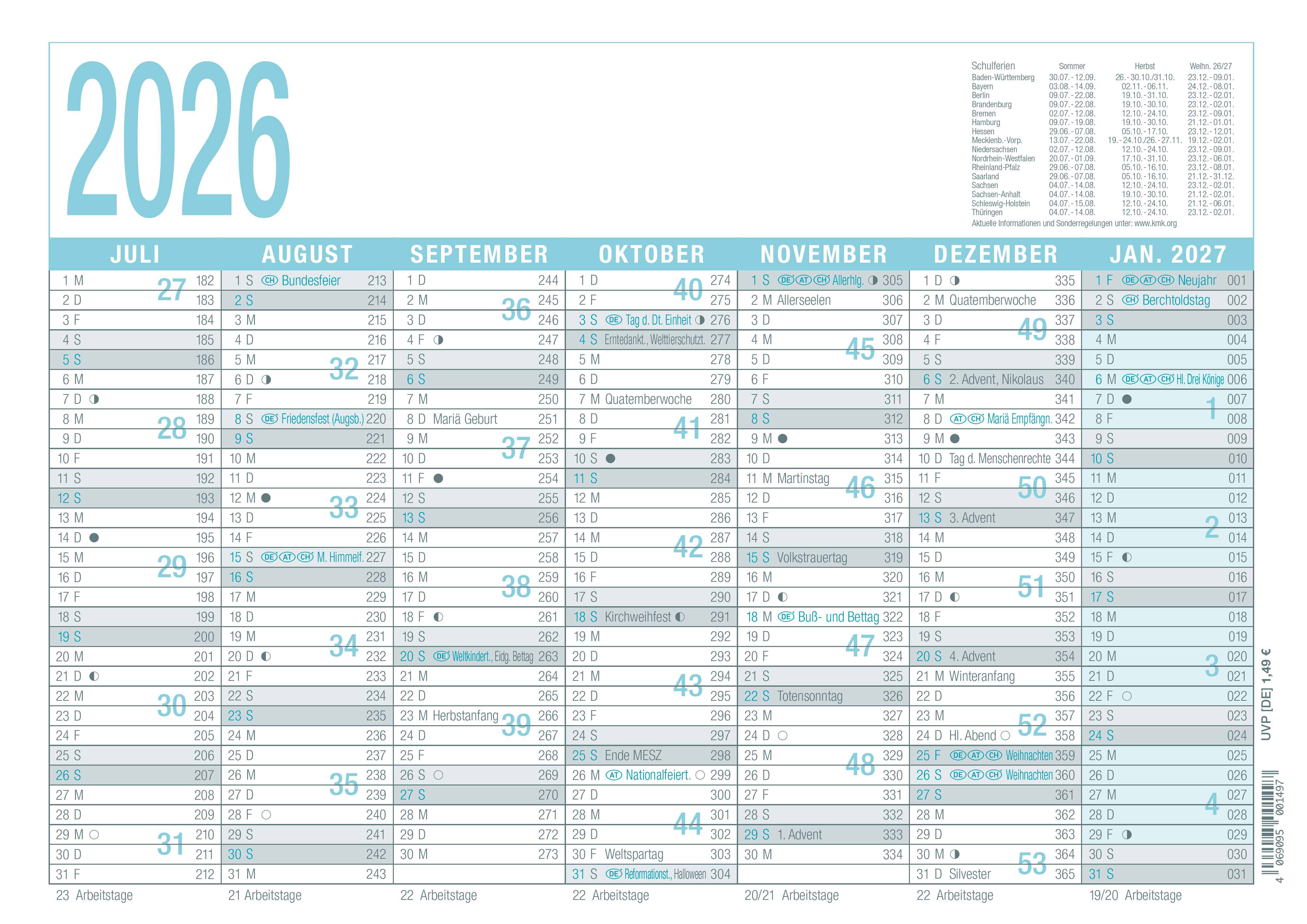 Produktbeschreibung Tafelkalender Zettler A4 1S/7M Türkis Arbeitstagekalender