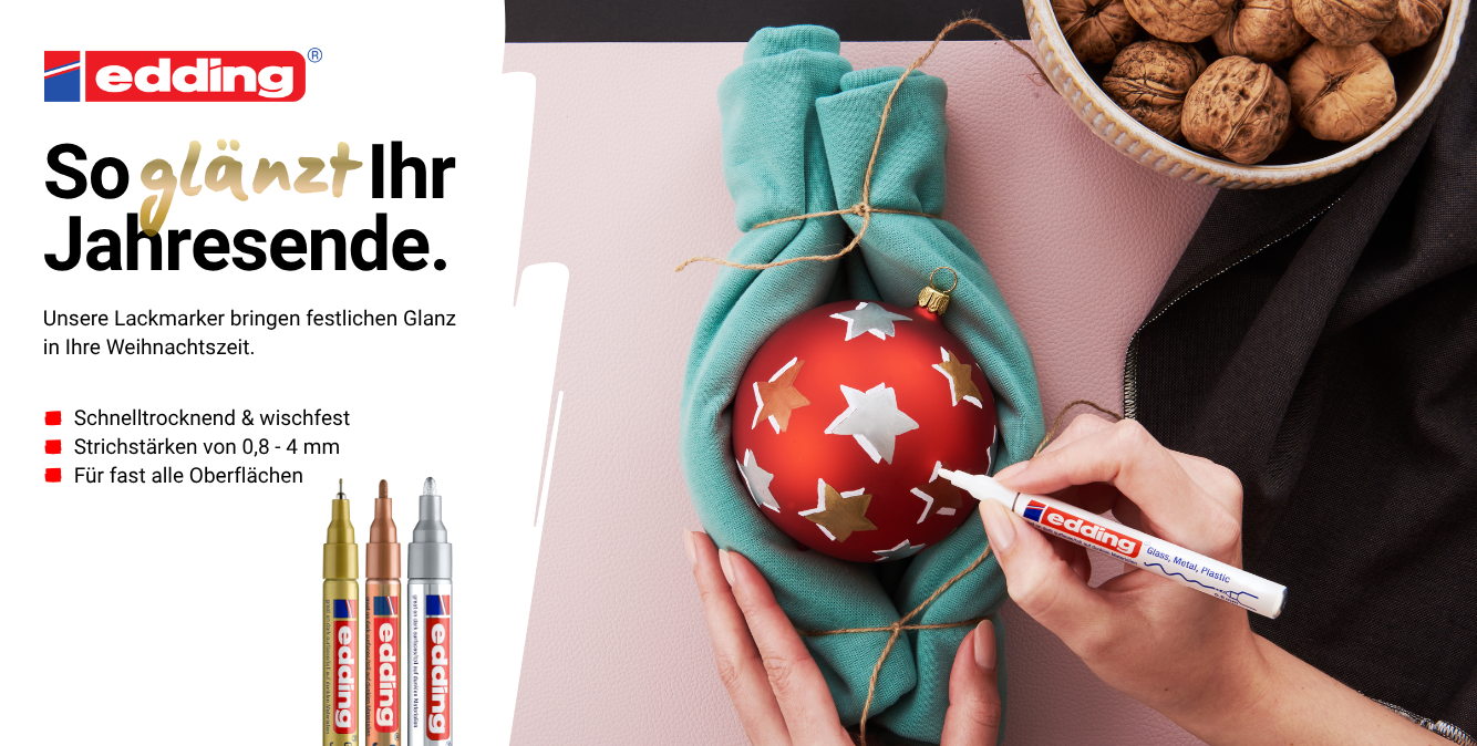 edding Lackmarker sorgen mit ihrer intensiven, dauerhaften Farbe für klare Linien und elegante Ergebnisse auf glatten Oberflächen wie Papier, Glas oder Metall. Ihre deckende, schnelltrocknende und wischfeste Tinte garantiert brillante Ergebnisse, die lange halten und vielseitig einsetzbar sind – für Projekte, Ideen und kreative Aufgaben, die weit über den letzten Tag des Jahres hinaus strahlen.