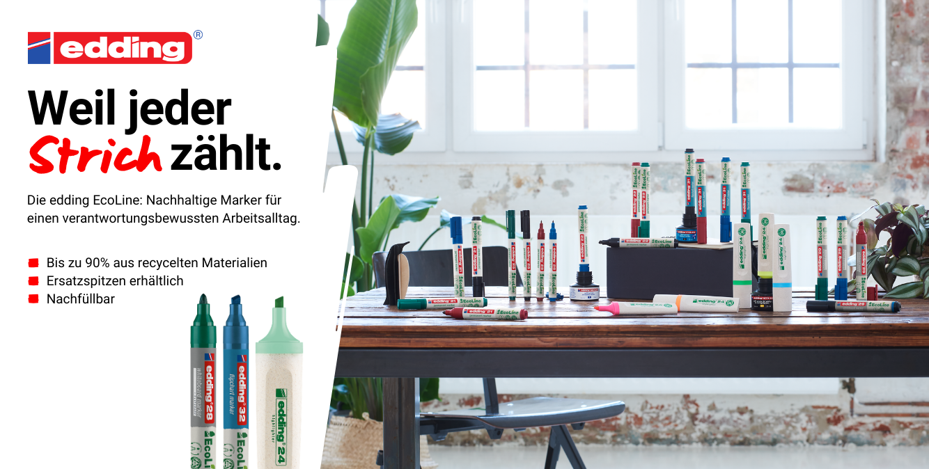 Die edding EcoLine verbindet bewährte Markerqualität mit einem klaren Fokus auf den verantwortungsvollen Umgang mit Ressourcen. Permanent-, Whiteboard- und Flipchartmarker bestehen zu mindestens 90 % aus recyceltem Kunststoff, während der EcoLine Highlighter überwiegend aus nachwachsenden Rohstoffen wie Zuckerrohr gefertigt wird. Nachfüllbare Systeme verlängern zusätzlich die Lebensdauer vieler Marker und tragen dazu bei, Abfall und Materialeinsatz zu reduzieren. So steht die edding EcoLine für die Überzeugung, dass auch im Büroalltag kleine Entscheidungen zu einem nachhaltigeren Umgang mit unserer Umwelt beitragen können.