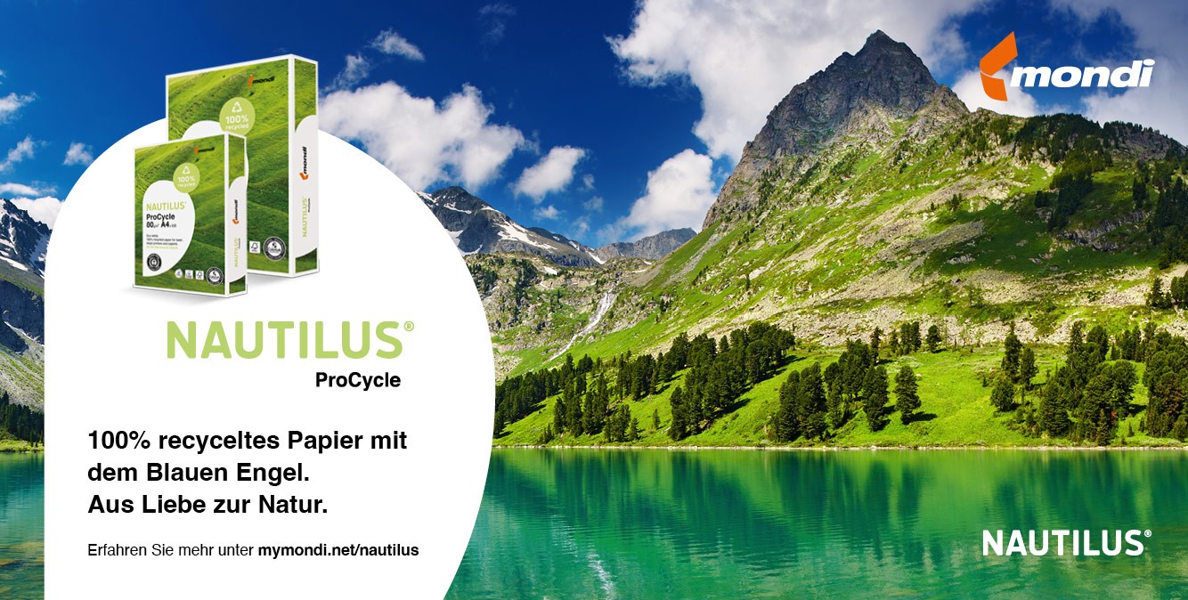 Die Produktfamilie NAUTILUS® steht für Recyclingpapier der höchsten Qualität, mit dem Sie unsere Natur schützen können, ohne dabei bei der Qualität Kompromisse eingehen zu müssen. NAUTILUS® bietet eine breite Palette hochweißer Recyclingpapiere für alle Anwendungen. NAUTILUS® ProCycle trägt die führenden Umweltzertifizierungen, wie Blauer Engel, FSC™ und das EU Umweltzeichen; somit setzen Sie mit jeder Anwendung ein klares Zeichen für unsere Umwelt!