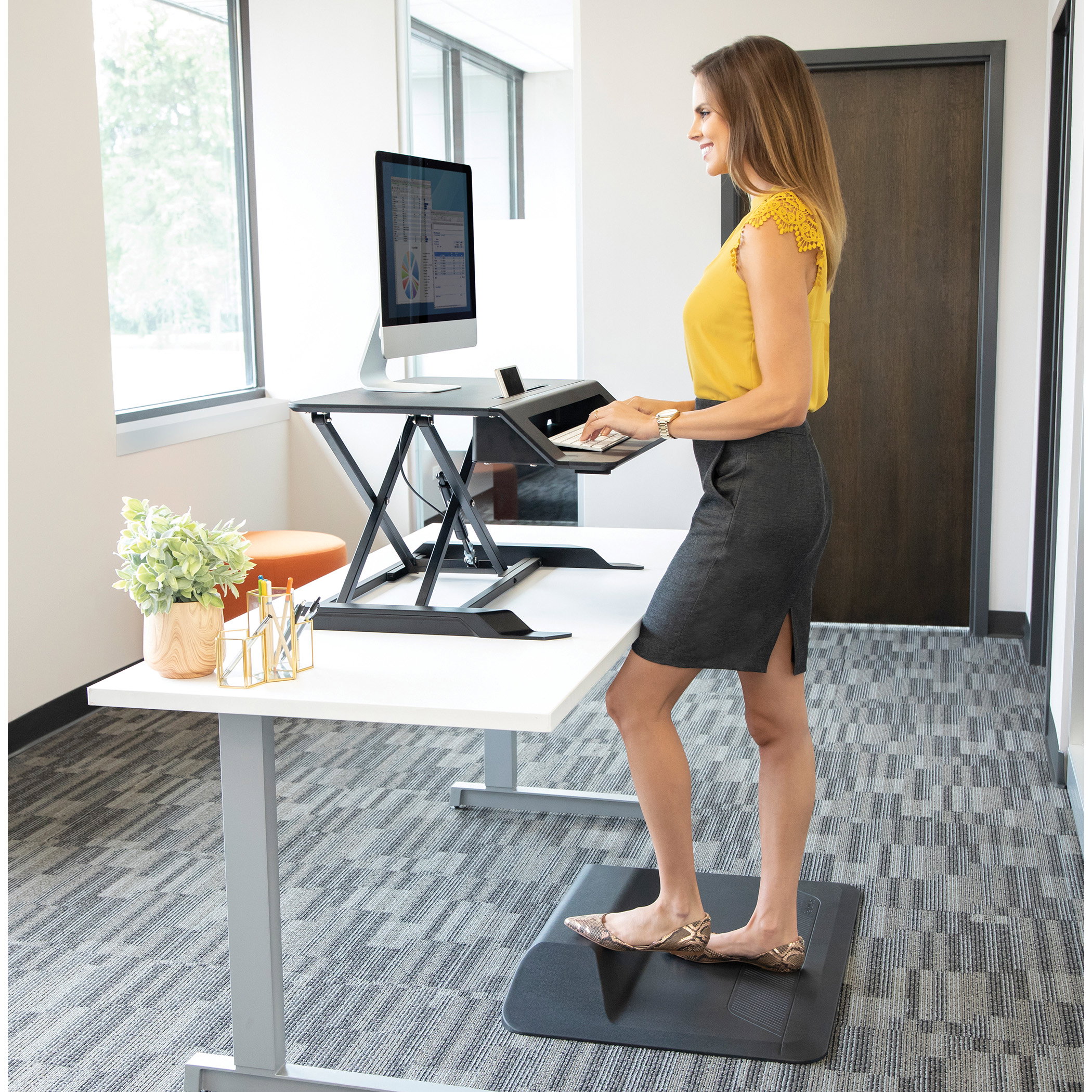 Verwandelt den klassischen Schreibtisch in einen dynamischen Sitz-Steh-Arbeitsplatz und bringt Bewegung in den Arbeitstag zur Förderung von aktiver und gesunder Arbeit. Einfache Höheneinstellung dank Gasfeder für einen leichten Übergang vom Sitzen zum Stehen. Flexibler Aufbau; geräumige obere Plattform für zwei Monitore oder einen Laptop - untere Ebene ideal für Tastatur und Maus. Praktischer Gerätekanal bietet Platz für weiteres Zubehör, wie Mobiltelefone. Einfach auspacken und loslegen. Kompatibel mit den Lotus_ Monitorarm Sets.